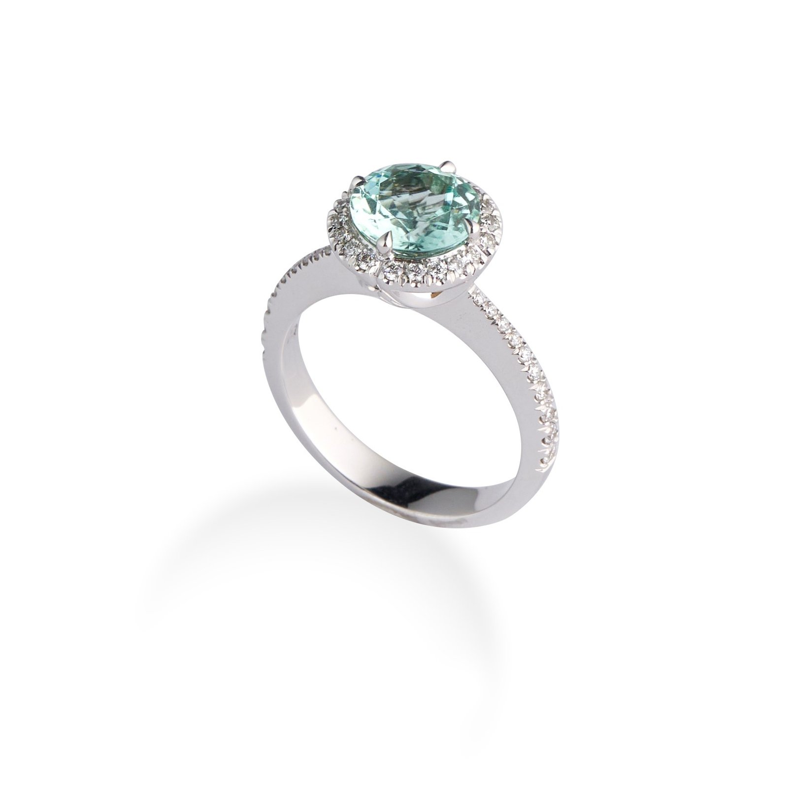 Atelier Heldwein “1902” ring with mint tourmaline and carmoization in white gold 5.6g 750/000 white gold 1x mint tourmaline 1.64ct. 40x diamonds brilliant 0.29ct. Ring size 54
