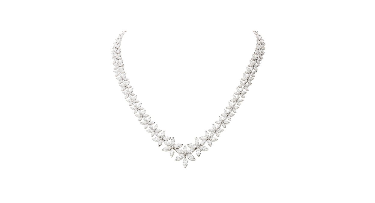 Atelier Heldwein “Diamond Blossoms” necklace 18 carat/- white gold 21.02g 279 navette cut diamonds G SI 22.66ct. 56 diamonds G SI 0.25ct. Length 43 cm
